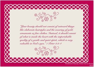 Hope this message encourages you not to put your hope in outer beauty that fades away, but the gentle and quiet spirit of inner beauty that does not fade – Carolyn Mahaney puts it well when she describes it as “a steadfast peace because of a steadfast trust in God”
